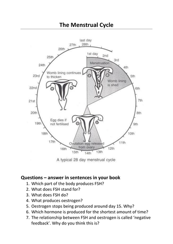 Menstrual cycle worksheet lesson plan template and teaching resources. The Menstrual Cycle The menstrual cycle is a monthly cycle in which a woman's uterus prepares for a fertilised egg to settle and grow into a baby. The progressive elevation of FSH allows many follicles to be recruited simultaneously.